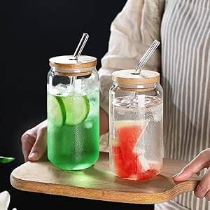 Generic - كوب زجاجي بغطاء من الخيزران وماصة زجاجية، كوب قهوة مثلجة 400 مل، كوب عصير وعصائر قابل لاعادة الاستخدام، برطمان شرب شفاف مع غطاء للمنزل والمقهى، قطعتين