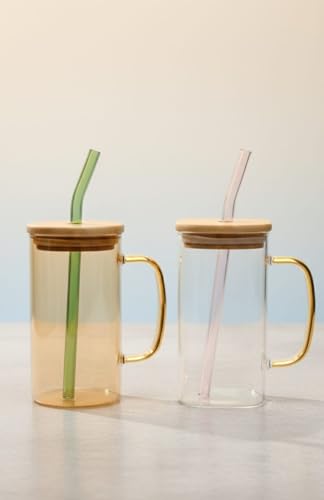 Generic - كوب زجاجي بمقبض ذهبي مع غطاء خشبي وشاليموه زجاجي، 500 مل، مثالي للقهوة المثلجة والسموزي والعصائر، غطاء محكم مانع للتسرب