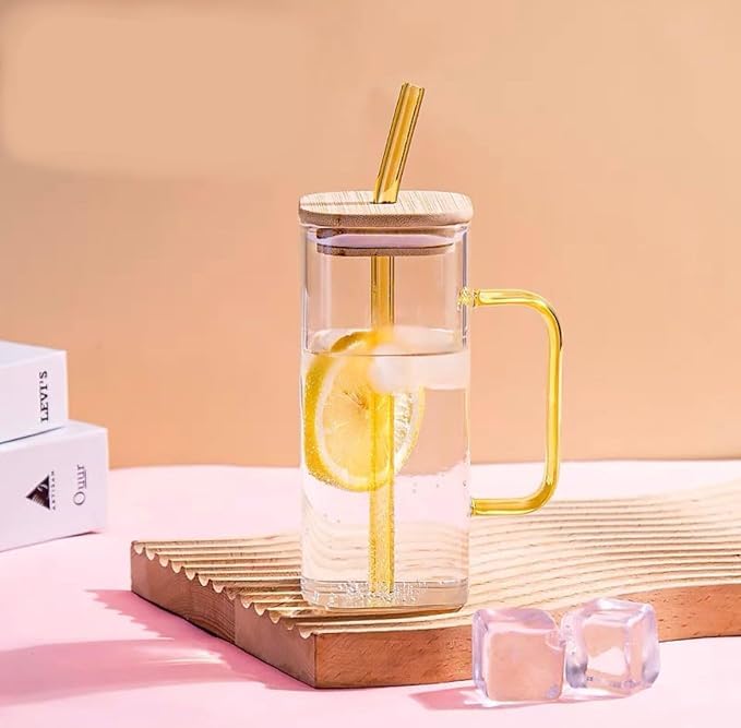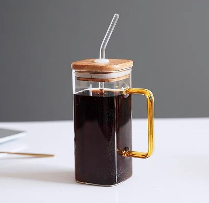 - تصميم عملي وأنيق: كوب زجاجي بسعة 500 مل مع مقبض ذهبي عصري وغطاء خشبي طبيعي يضيف لمسة جمالية راقية