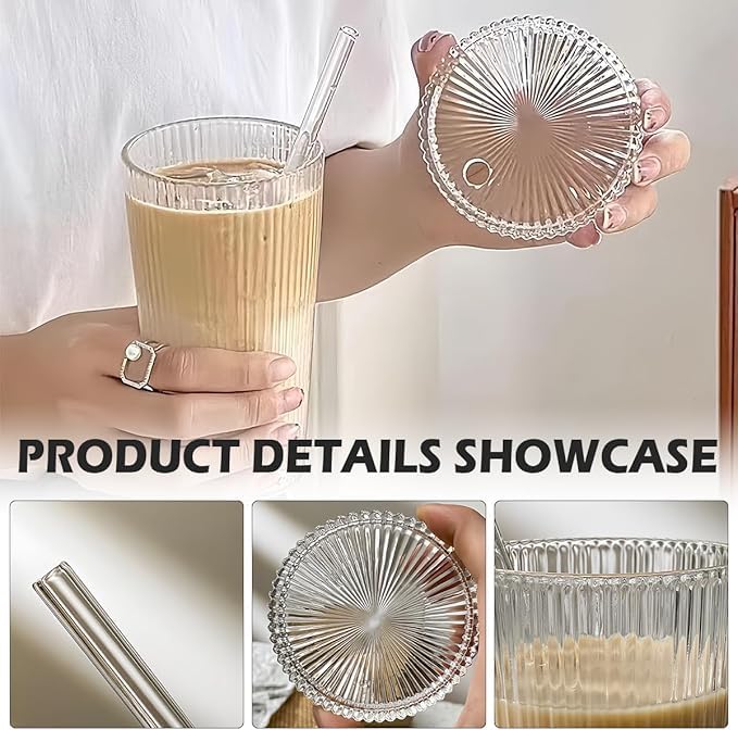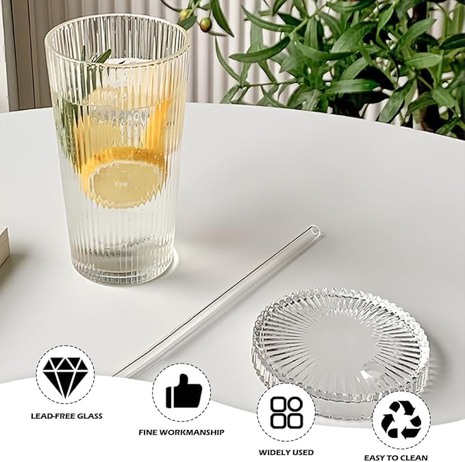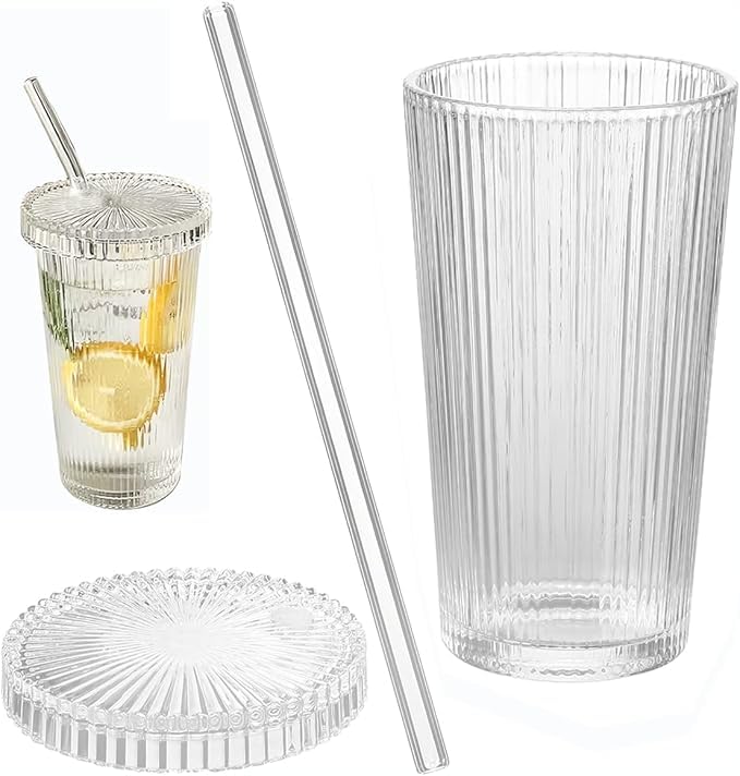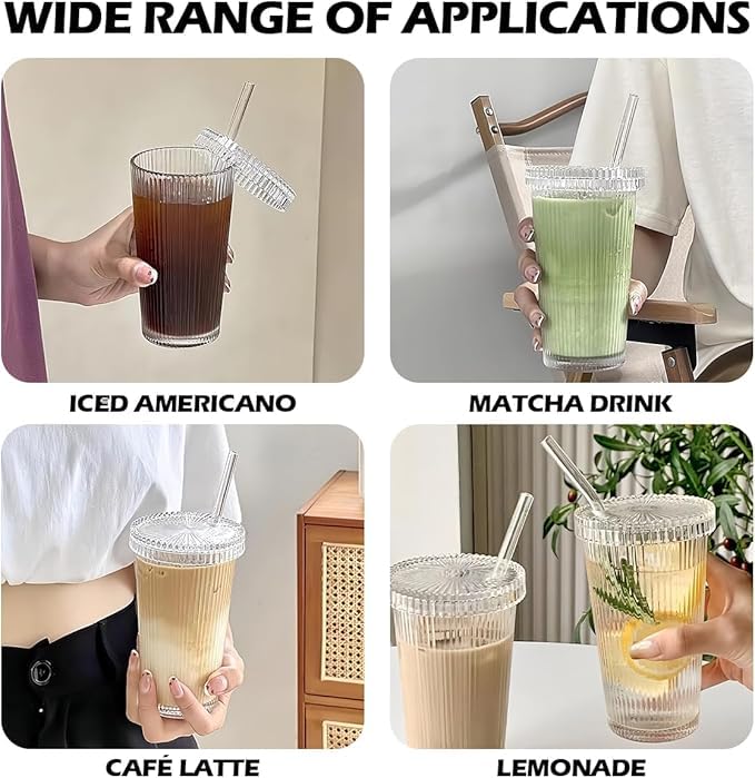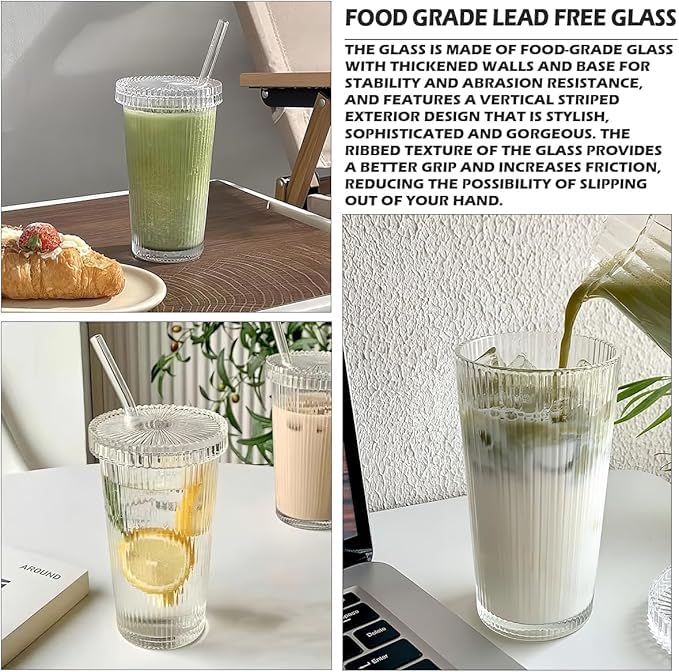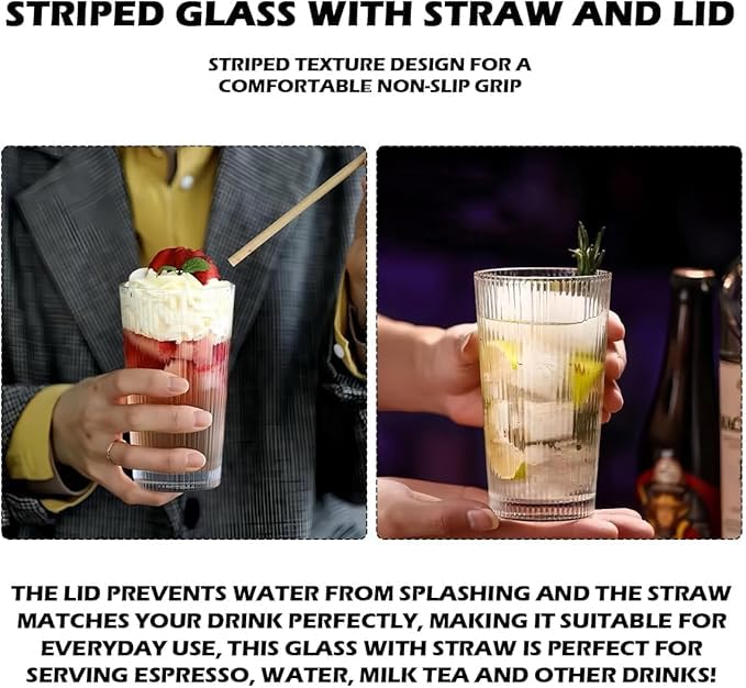Generic - أكواب زجاجية بأغطية وشفاطات زجاجية، كوب زجاجي مخطط شفاف للقهوة المثلجة، أكواب شرب للعصير والمشروبات والقهوة المثلجة والشاي والعصائر والصودا واللبن