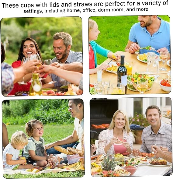 - تغليف مريح: يأتي كل كوب مع غطاء وقشة، يلبي تفضيلات الشرب المختلفة. يساعد مزيج الغطاء والماصة على منع الانسكابات والحفاظ على الغبار والبقع بعيدًا عن الكوب، مما يضمن تجربة شرب نظيفة.