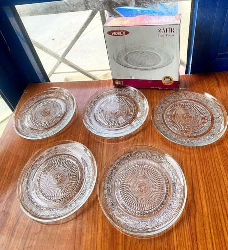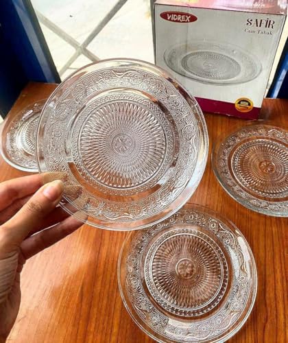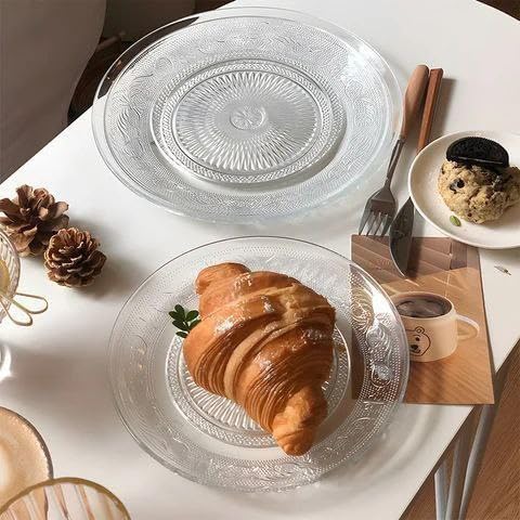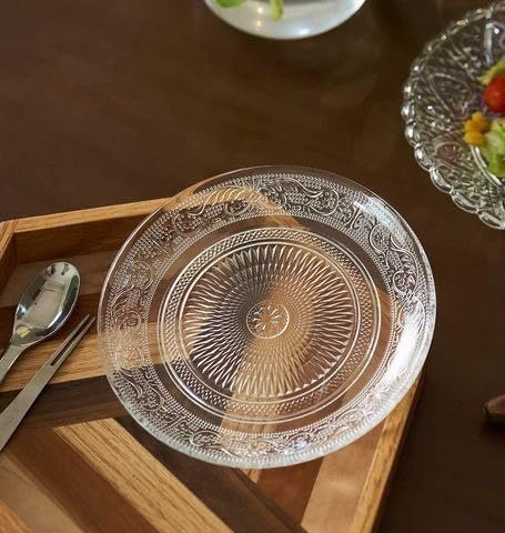 - تصميم أنيق: طقم مكون من 6 أطباق حلويات زجاجية تتميز بنقشات بارزة ومعقدة مع مركز بنمط شعاع شمسي وحواف بنقشة زهور مزخرفة تضفي لمسة راقية على أي طاولة.