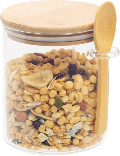 AREXOL - برطمان زجاجي مربع سعة 240 مل لتخزين التوابل والبقوليات مع غطاء محكم الغلق من الخيزران مع ملعقة خشبية لسهولة الاستخدام والحفاظ عليه طازجًا في حاوية زجاجية للمطبخ
