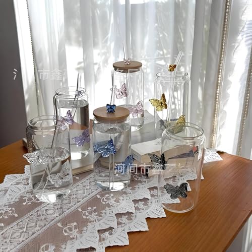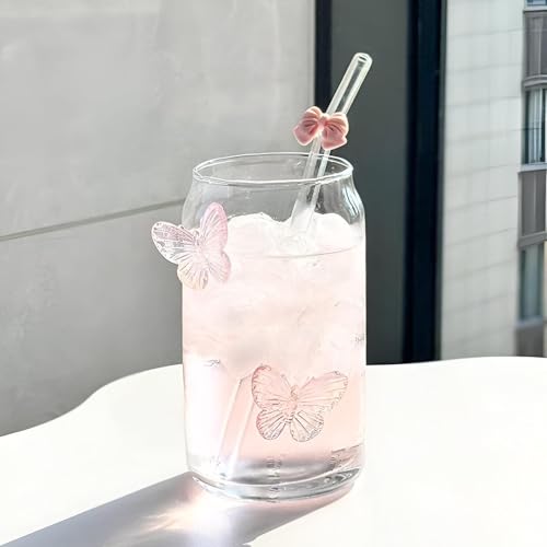 Generic - مج زجاج بتصميم فراشة وردية ثلاثية الأبعاد بتصميم أنيق مع شفاطة وغطاء ذهبي، مزخرف بفيونكة لترطيب يومي مميز، 550 مل