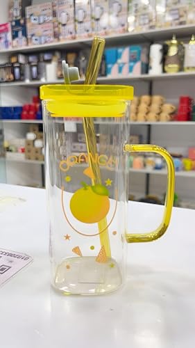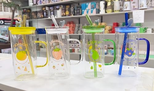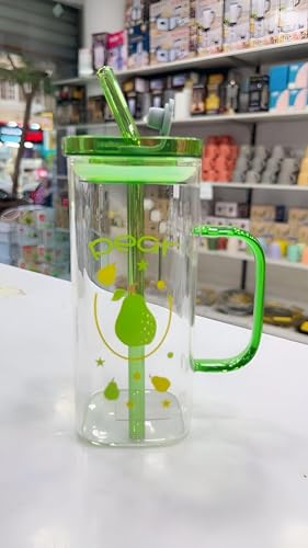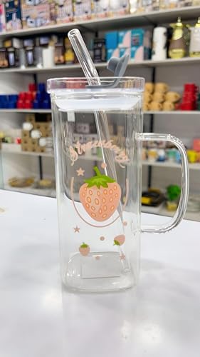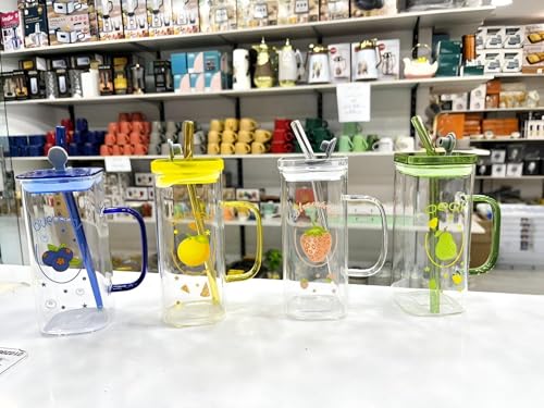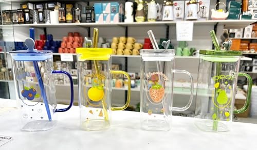 Generic - مج زجاجي - كوب بوروسيليكات مربع متعدد الالوان مقاوم للحرارة مع ماصة زجاجية قوية، سعة 400 مل، وغطاء اكريليك محكم لكل من المشروبات الساخنة والباردة بتصميم عالي الجودة
