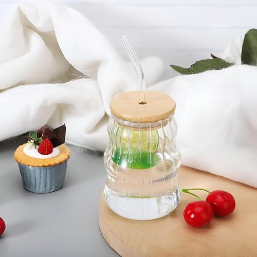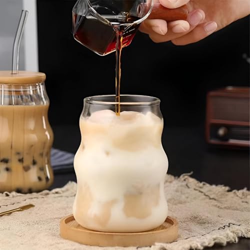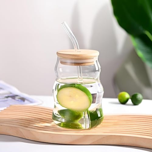 Generic - مج زجاج بتصميم ذو أوجه متعرجة مع غطاء ومقبض خشبي للقهوة أو المشروبات، سعة 450 مل، مصنوع من زجاج نقي