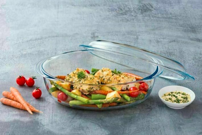 - هيكل زجاجي فاخر: مصنوع من زجاج متين عالي الجودة يتحمل درجات حرارة الفرن العالية ويوفر توزيعًا ممتازًا للحرارة للحصول على نتائج طهي متساوية