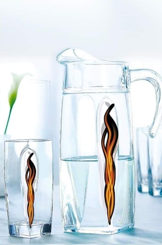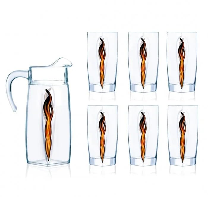 - تصميم أنيق: يتضمن الطقم شفشق زجاجي أنيق و6 أكواب شرب متطابقة، كل منها يتميز بتصميم نمط لهب مميز.