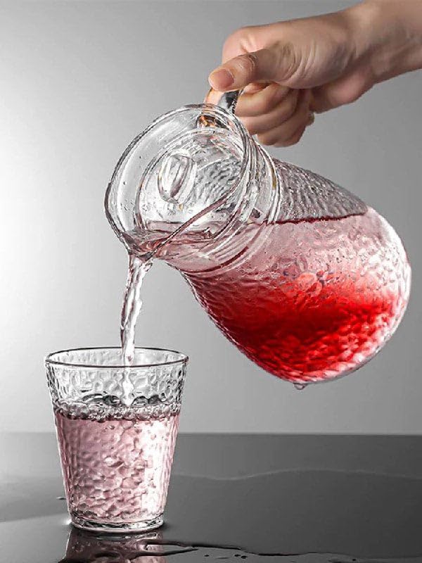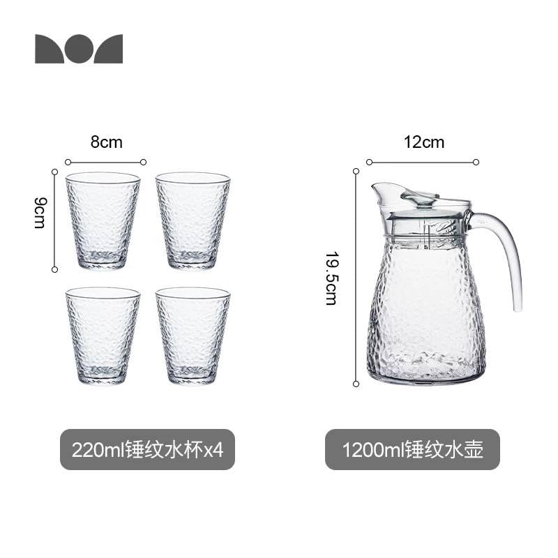- مجموعة كاملة: تتضمن مجموعة الأواني الزجاجية الأنيقة إبريق محكم سعة 1200 مل وأربعة أكواب شرب سعة 220 مل بتصميم بنمط مطروق