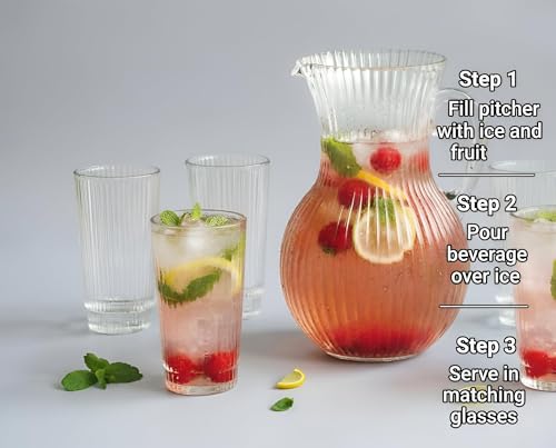 - يضيف الملمس المضلع العمودي الذي يزين كل من الإبريق والأكواب جاذبية بصرية متطورة لا تتأثر بمرور الزمن مع توفير قبضة آمنة وغير قابلة للانزلاق - مثالية للتعامل مع المشروبات الباردة مع الثلج، سواء في الشواء الصيفي أو حفلة عشاء داخلية.