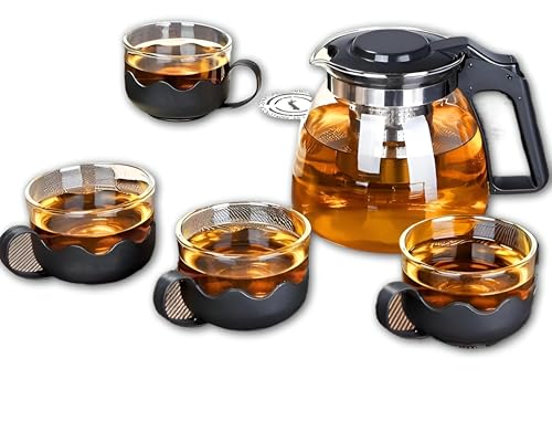 - تتميز مجموعة تقديم الشاي الزجاجية هذه بإبريق شاي زجاجي مع فلتر مدمج من الستانلس ستيل لتصفية الشاي السائب أثناء الصب، مما يجعل الروائح الغنية تطفو بحرية في كوبك مع الحفاظ على أوراق الشاي بعيدًا عن كل سكب والحفاظ على عرض نظيف على الطاولة.