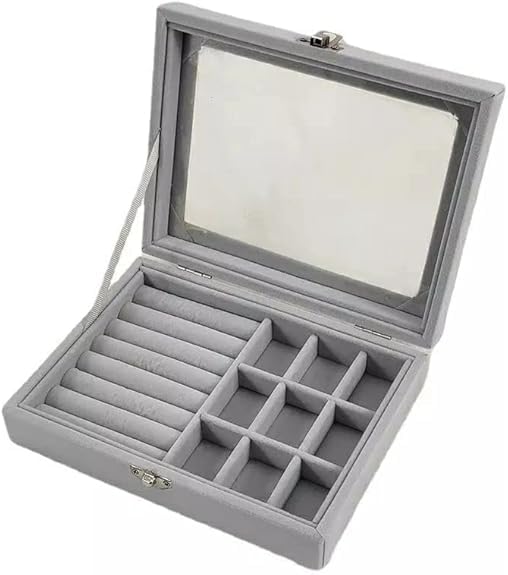 Generic - صندوق تخزين من القطيفة مزود بـ 9 اقسام من الزجاج للخواتم والمجوهرات وحامل منظم للحلقان مصنوع من خليط معدني