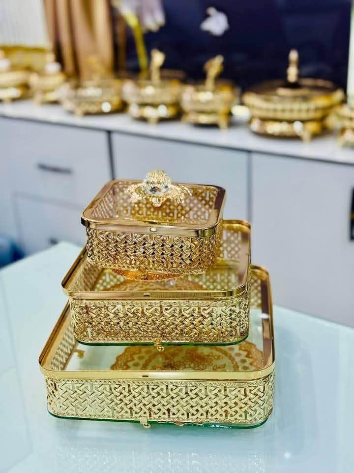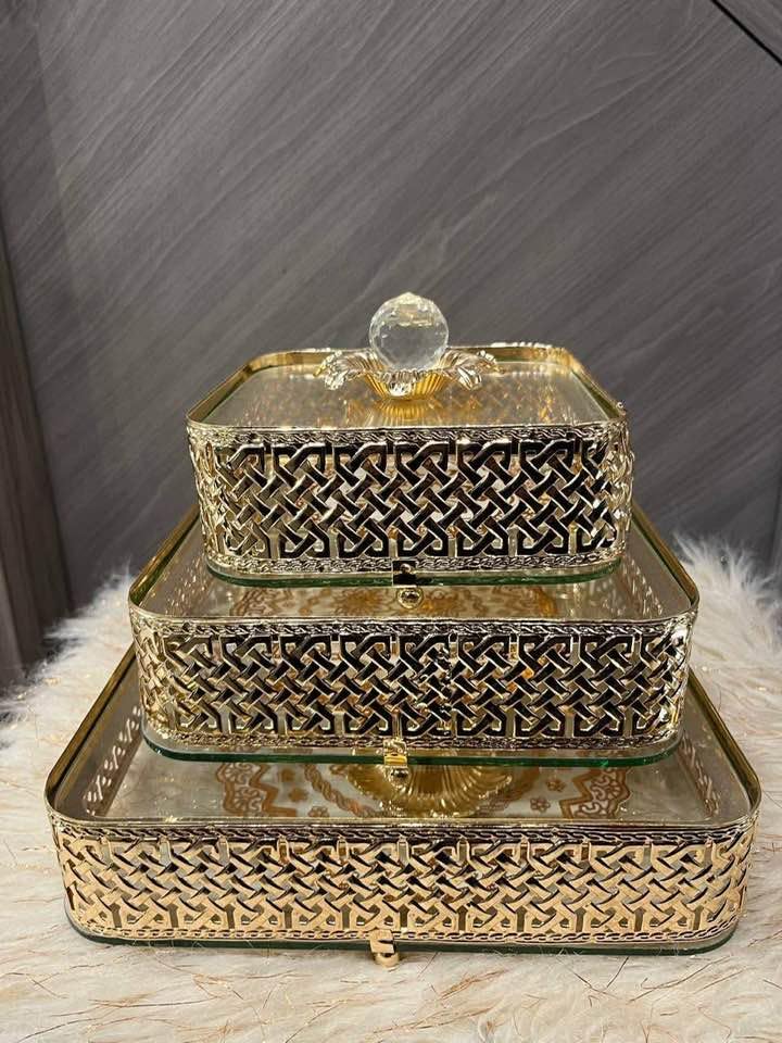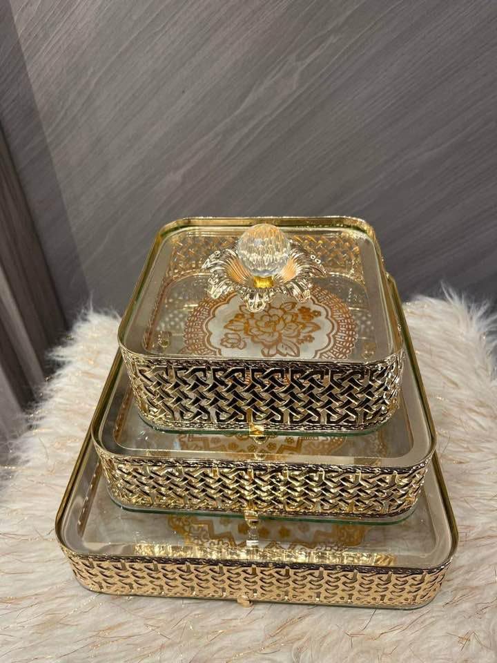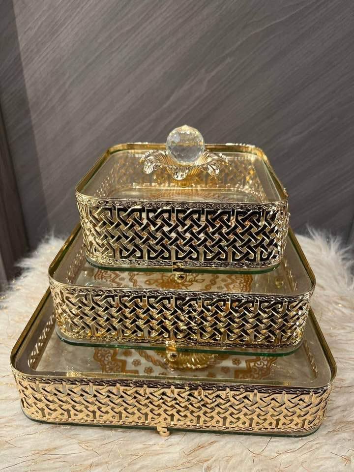 Generic - طقم تقديم و تخزين زجاجي مع إطار معدني ذهبي، ٣ قطع متدرجة الحجم، تصميم منقوش فاخر مع مقابض كريستالية