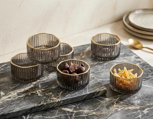 Generic - طقم تقديم زجاجي مكون من 6 قطع بتصميم هندسي رمادي شفاف مع اطار ذهبي، مثالي للحلويات والمكسرات والكراميل - تصميم فاخر عصري وعالي الجودة ومتعدد الاستخدامات وسهل التنظيف