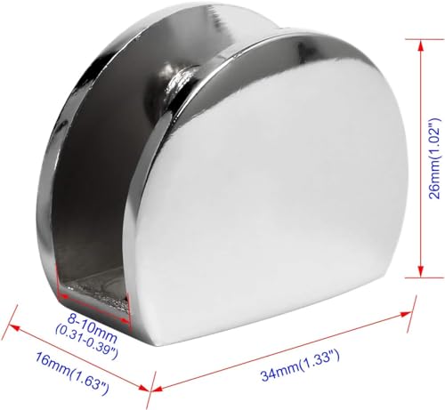 - ✔ مشابك زجاجية نصف دائرية من خليط الزنك (الأبعاد): متوافقة مع الزجاج 8 ~ 10 ملم / 0.31 انش ~ 0.39 انش. 1.02 انش / 26 ملم × 1.33 انش / 34 ملم × 0.63 انش / 16 ملم (الطول × العرض × الارتفاع)، مسافة الفتحة: 20 ملم / 0.78 انش، سمك الجدار: 2.4 ملم / 0.09 انش.