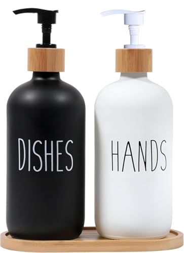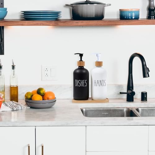 - تصميم أنيق وعملي = نمط كلاسيكي باللونين الأبيض والأسود مع ملصقات واضحة ("الأيدي" و"الأطباق") لمنع خلط الصابون مع تحسين ديكور منزلك.