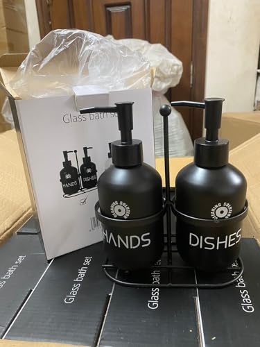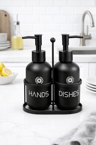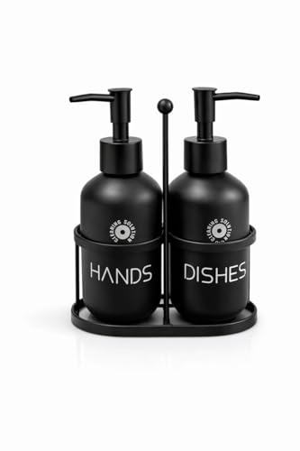 Generic - مجموعة موزع صابون زجاجي لحوض المطبخ - زجاجات لليدين والاطباق مع حامل معدني لصابون الاطباق وغسل اليدين واللوشن والشامبو (اسود)