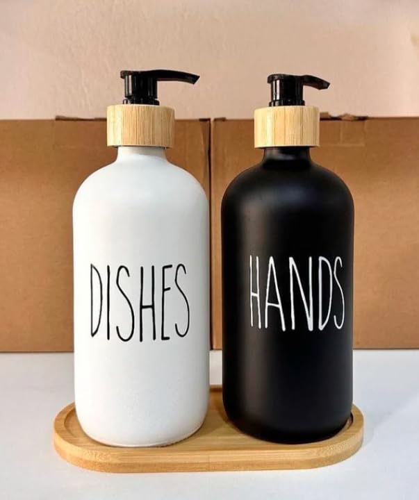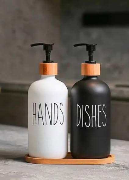 - مجموعة موزع كاملة: تتضمن 2 موزع مضخة زجاجية مع لمسات من الخيزران وحامل خشبي مطابق، يتميز بملصقات "اليدين" و "الأطباق" لسهولة التعرف عليها في مطبخك أو حمامك