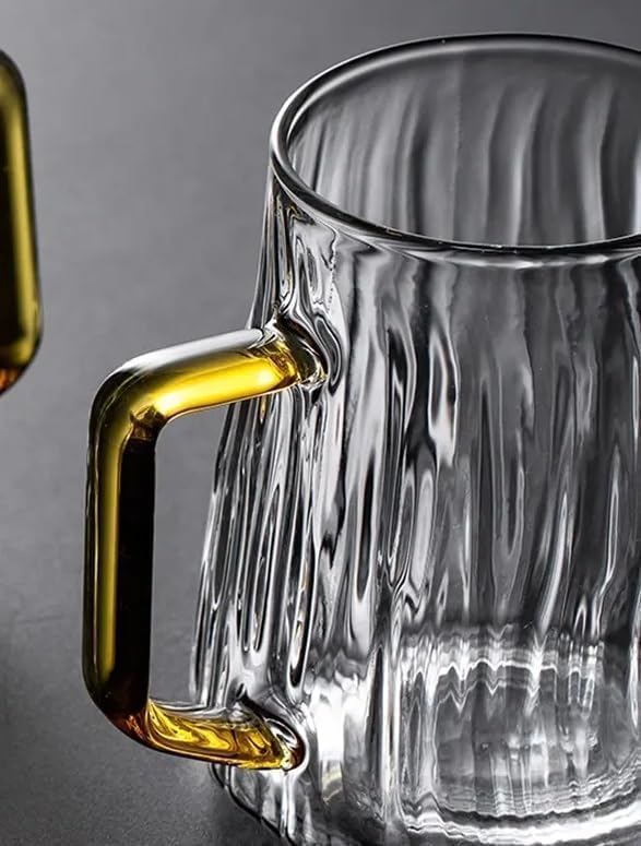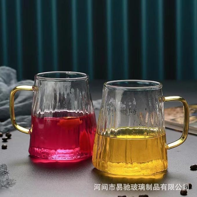 - مج زجاج كبير للشاي والقهوة والمشروبات الباردة بمقبض بلون اصفر - 400 مل - شكل مخروطي