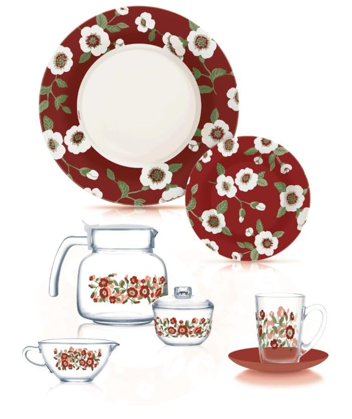 Generic - طقم شاي زجاجي بتصميم زهور حمراء وابريق شاي واكواب مع اطباق مطابقة، مجموعة من 24 قطعة