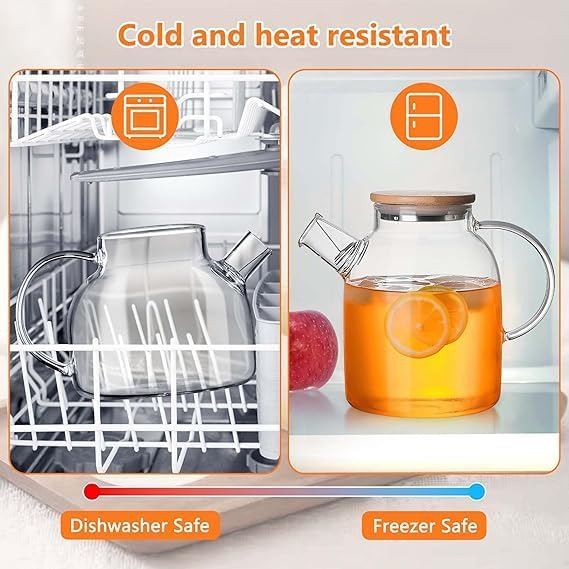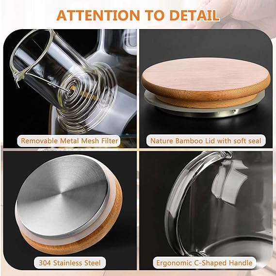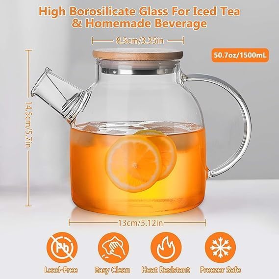 Generic - ابريق شاي زجاجي امن على الموقد بسعة 50 اونصة/1500 مل، ابريق شاي من زجاج البوروسيليكات مع غطاء من الخيزران وفوهة فلتر قابلة للازالة لفلترة الاوراق السائبة والشاي المزهر قطعة واحدة