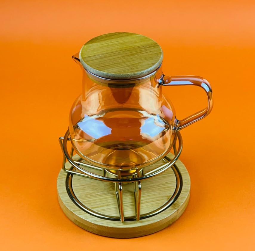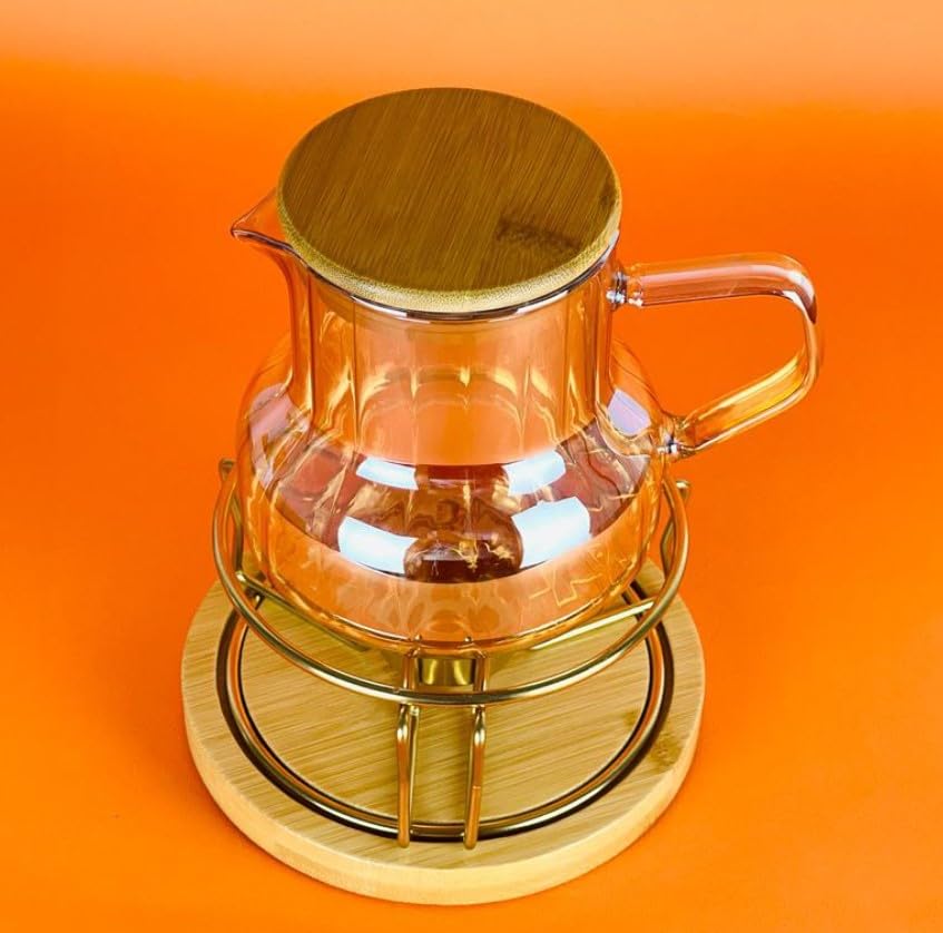 Generic - ابريق شاي زجاجي مع غطاء من الخيزران وحامل للتدفئة، اطار معدني ذهبي، مجموعة تخمير مقاومة للحرارة