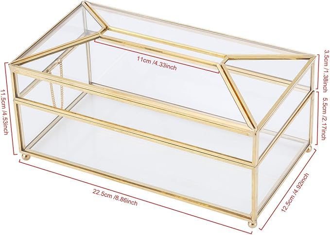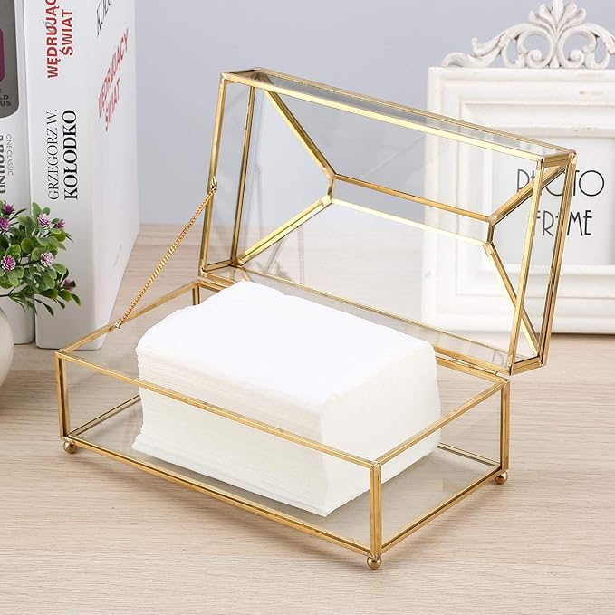 - تصميم أنيق: حامل علبة مناديل زجاجي بإطار معدني ذهبي فاخر وألواح شفافة، مما يضيف لمسة راقية إلى ديكور أي غرفة