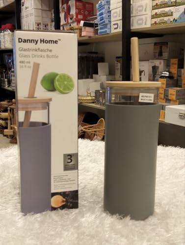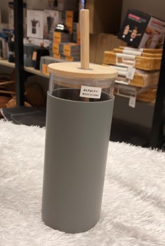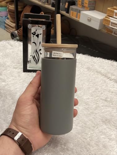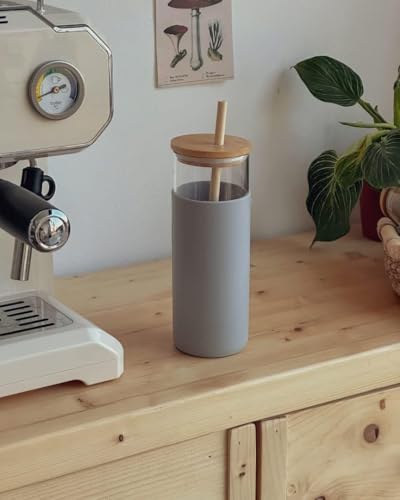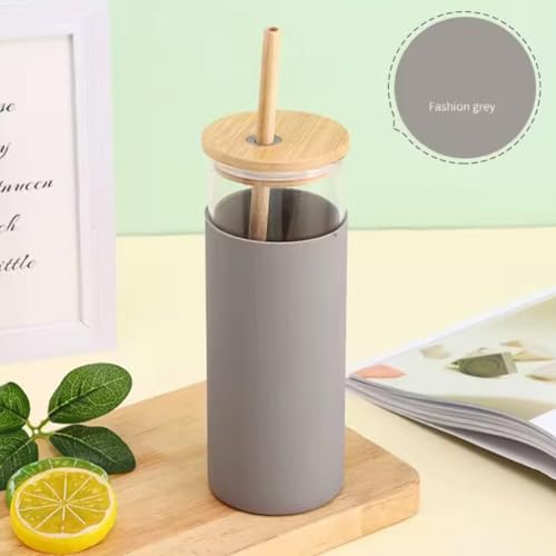 Generic - كوب زجاجي بغطاء من الخيزران، حافظة من سيليكون بلون رمادي وشفاطة قابلة لإعادة الاستخدام، سعة 480 مل