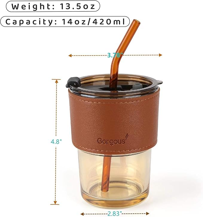 Generic - كوب زجاجي مع حافظة جلدية وماصة وغطاء، بني، 500 مل