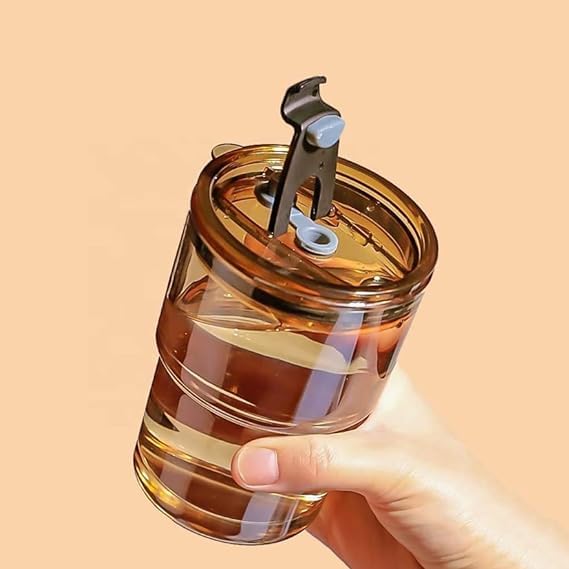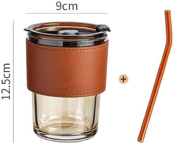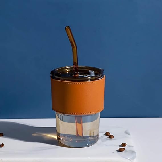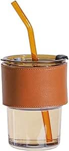 Generic - كوب زجاجي بغطاء وشفاطة وحافظة جلد، سعة 14 اونصة، لون كهرماني