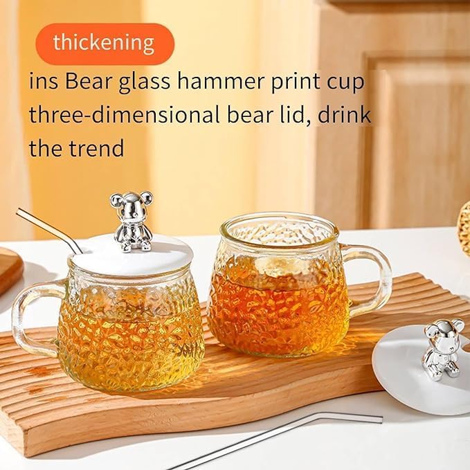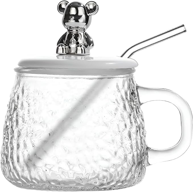 - تصميم سطح بلوري على الجسم: ليس فقط كوبًا زجاجيًا عمليًا، لكنه أيضًا يتميز بمظهر جمالي مبهج. يتميز الجسم بسطح بلوري مزخرف يضاف إلى لعبة دب فضية على الغطاء البلاستيك الأبيض في الأعلى. كما أن المقبض كبير بما يكفي لإمكانبة حمله بكلتا اليدين. مثالي للقهوة والشاي والعصائر والمشروبات وما إلى ذلك.