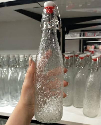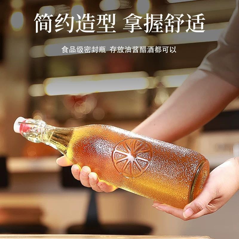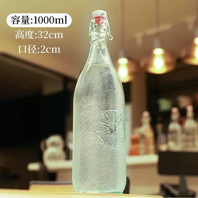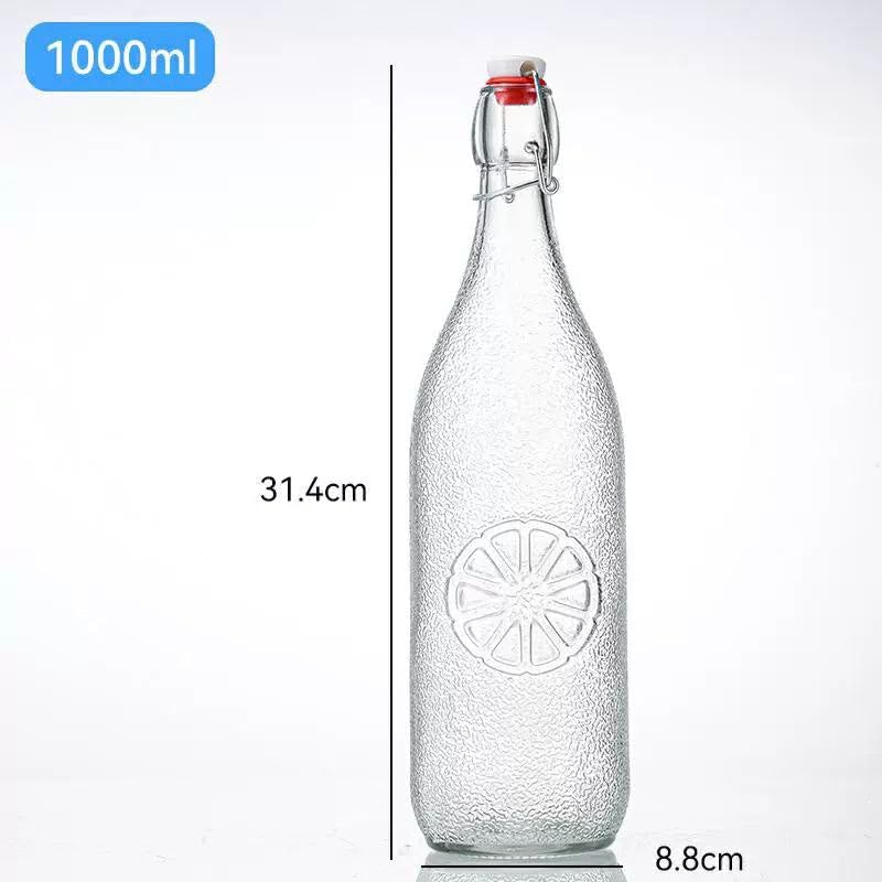 - زجاجة زجاجية فاخرة: زجاجة زجاجية بسعة 1 لتر مع تصميم سطح مزخرف ونقش عجلة الحمضيات، مثالية لتخزين المشروبات.