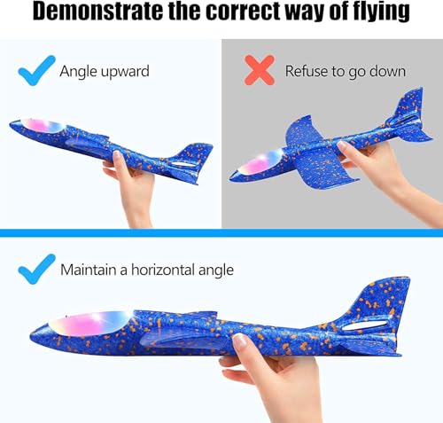 - وضعان للطيران: يمكن للطائرة الإسفنجية التي ترمي باليد أن تطير في وضع متوازي أو دوران عند تركيب الطائرة بطرق مختلفة. يوجد فتحتان في ذيل الطائرة. أدخل جناح الذيل في الفتحة السفلية، وستطير الطائرة في وضع الطائرة الشراعية. أدخل جناح الذيل في الفتحة العلوية، وستطير الطائرة في الوضع العكسي. يحتوي جسم الطائرة على ضوء فلاش LED يجعلها جميلة، ويمكن أن تطير في الليل، مما سيجلب متعة هائلة للأطفال.