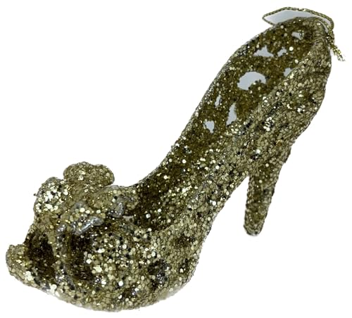 - تصميم أنيق: زينة حذاء براقة عالية الكعب مغطاة ببريق ذهبي لامع، مثالية لإضافة لمسة من الرقي إلى أي عرض.
