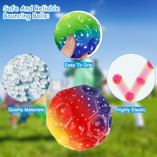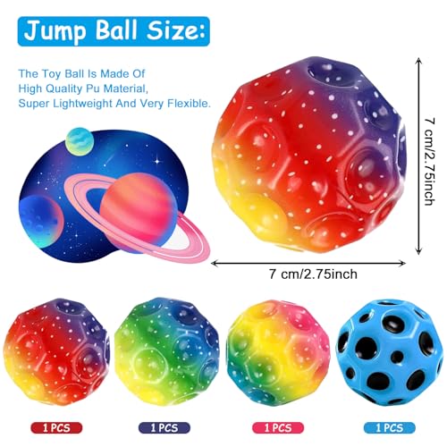 - 4 قطع من كرات القفز الفلكية: قطر الكرة 7 سم، والتي تزن 55 غرام فقط، لذلك يمكنك الإمساك بها والتحكم بها بسهولة، سهلة الحمل. يمكنها تحمل الألعاب التي لا نهاية لها دون أن تتشوه أو تقفز..
