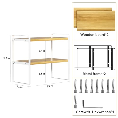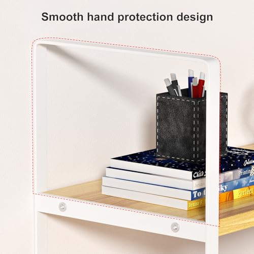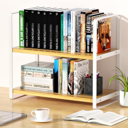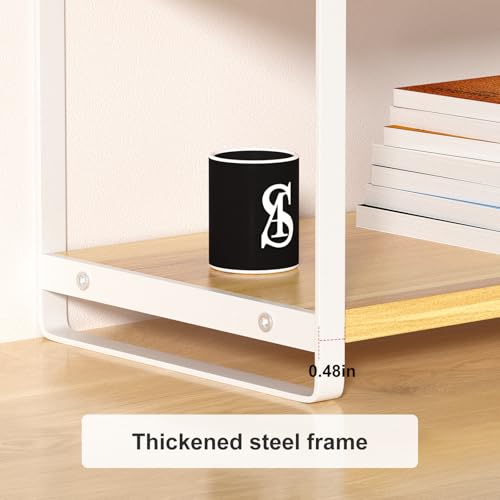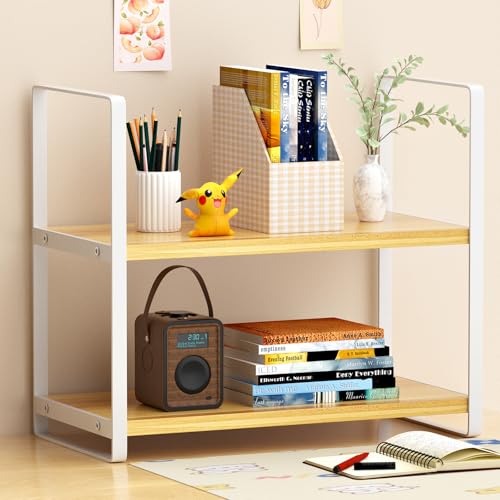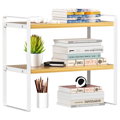 Gloserin - رف منظم للكتب خشبي، رف تخزين مكتبي من مستويين لسطح المكتب ودولاب الملابس والسكن الجامعي والمنزل من جلوسيرين (إطار أبيض وخشب طبيعي)