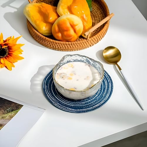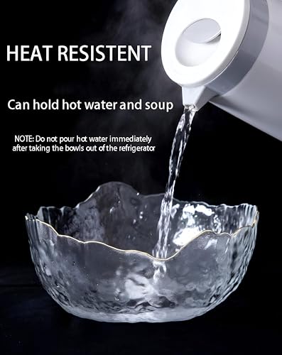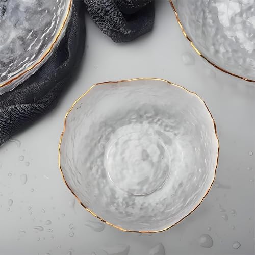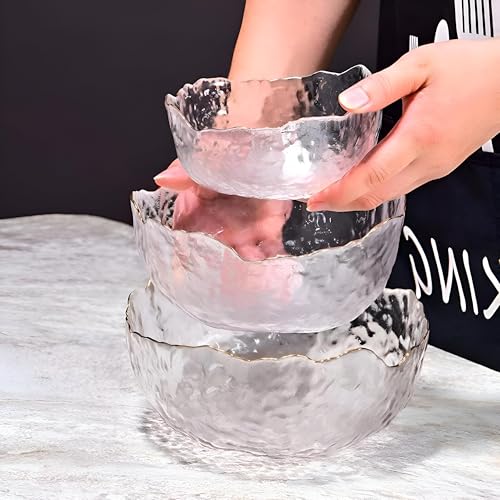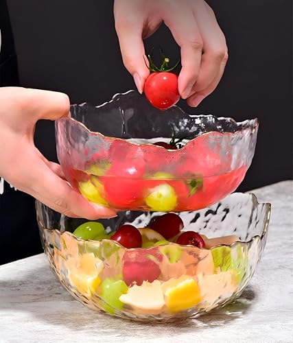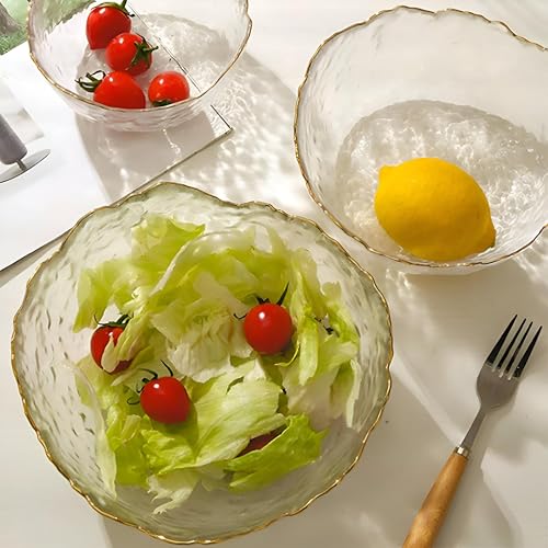 - طقم أوعية زجاجية من ثلاث قطع بحافة ذهبية، مصمم لتقديم الفواكه والوجبات الخفيفة بلمسة فاخرة على أي طاولة.