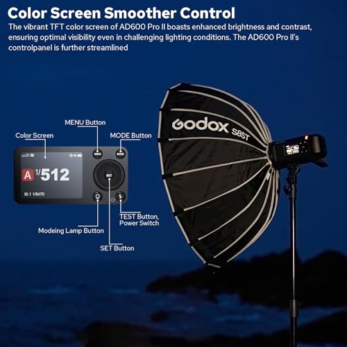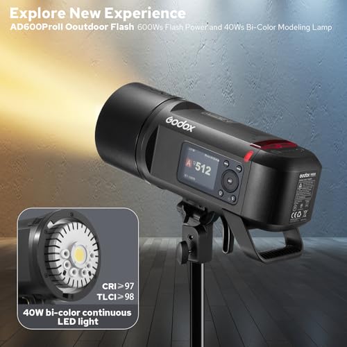 GODOX - فلاش ستروب AD600 بروII للاستخدام الخارجي، 600 واط GN87 1/8000s 2.4G فلاش لاسلكي قوي مع مصباح ليد بقوة 40 وات، 0.01-0.9 ثانية إعادة تدوير بوينز ماونت ستوديو فلاش من جودوكس