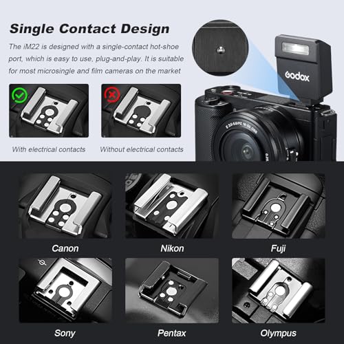 - 【 توافق واسع 】 تصميم قاعدة التثبيت الساخنة أحادي التلامس يعمل بمجرد توصيله، ليناسب معظم الكاميرات التي لا تحتوي على مرآة وكاميرات الأفلام مثل كاميرات سوني zv1 وzve10... فقط قم بتثبيته وابدأ التصوير. يُعد فلاش الكاميرا الصغير iM22 من جودوكس هدية رائعة لكاميرات كانون وسوني ونيكون وفوجي واوليمبوس (مع الكاميرات ذات نقطة التلامس العالمية). لا يتوافق الفلاش الصغير مع كاميرات سوني ZV-1F والفا 9III و99 و77 و350 وغيرها من الكاميرات التي لا تحتوي على نقطة تلامس عالمية.