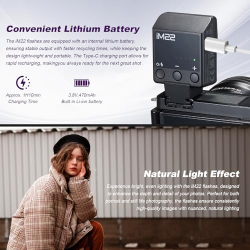 - 【 مليء بالطاقة 】 يأتي فلاش iM22 ببطارية ليثيوم داخلية بسعة 470mAh مما يضمن إخراجًا ثابتًا مع أوقات شحن أسرع. يسمح منفذ الشحن من النوع سي بإعادة الشحن السريع مما يجعلك مستعدًا دائمًا لالتقاط الصور الرائعة التالية. بقدرتها على توفير ما يصل إلى 440 ومضة بكامل القوة، ووقت إعادة شحن لا يتجاوز 3 ثوانٍ، تضمن وحدات الفلاش هذه أنه يمكنك التقاط اللحظات الرائعة بسرعة وموثوقية.