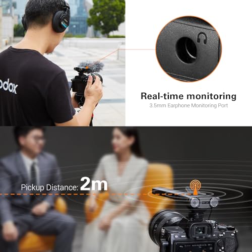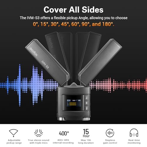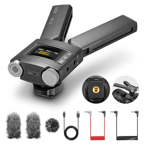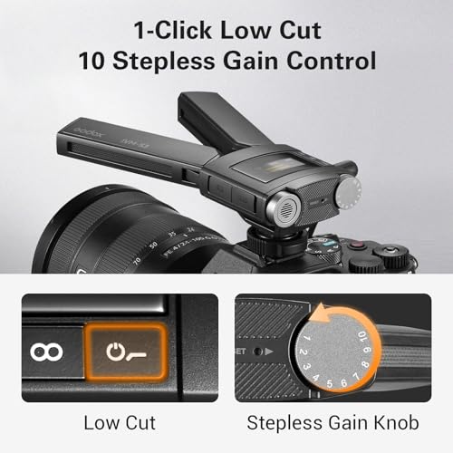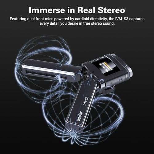 GODOX - يكروفون ستيريو يثبت على الكاميرا، ميكروفون كاميرا بقاعدة كولد شو وتصميم منخفض بنقرة واحدة، تحكم في الكسب 10 بدون خطوات، فتحة بطاقة ذاكرة متوافق مع الكاميرات والأجهزة الذكية من جودوكس IVM-S3، أسود