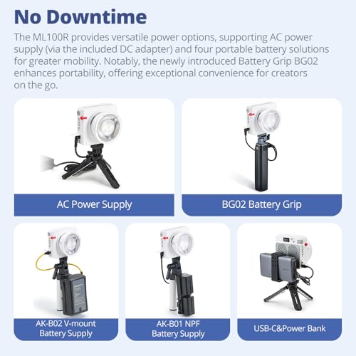 - يأتي ML100R مع المزيد من ملحقات الإضاءة المحمولة والمزيد من خيارات الطاقة المحمولة لتعزيز تعدد الاستخدامات. يضمن عامل الشكل المدمج والسطوع المتميز أداءً متميزًا في التصوير في الهواء الطلق. توفر الوظيفة القابلة للتعديل بالألوان الكاملة إمكانيات إبداعية لا حصر لها، مما يسمح لك بخلق جو مثالي.