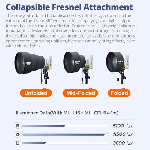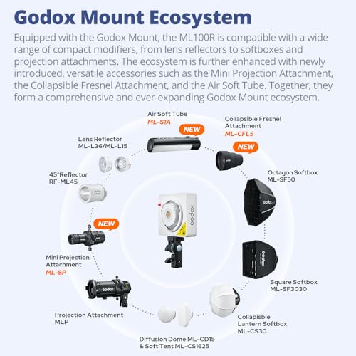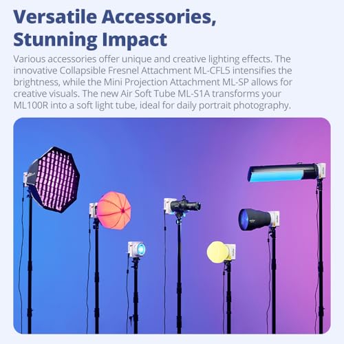 - توفر الملحقات المختلفة تأثيرات إضاءة فريدة ومبتكرة. يعمل ملحق فريسنل المبتكر القابل للطي ML-CFL5 على تكثيف السطوع، بينما يسمح ملحق الإسقاط الصغير ML-SP بصور إبداعية. أنبوب اير سوفت الجديد ML-S1A يحول ML100R الخاص بك إلى أنبوب إضاءة ناعم، مثالي للتصوير الفوتوغرافي اليومي.