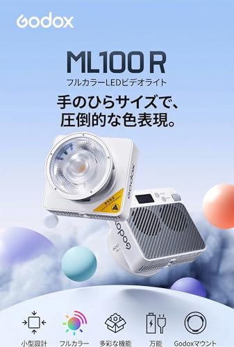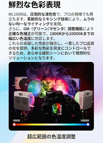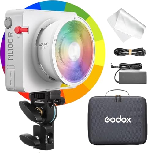 GODOX - إضاءة فيديو ليد ML100R بألوان كاملة ار جي بي بحجم الجيب مع عاكس 15 درجة قابل للتبديل، 1800-10000 كلفن سي سي تي، 14 تأثير اف اكس سينمائي، خيارات طاقة متعددة، تدعم التحكم عن طريق التطبيق من جودوكس