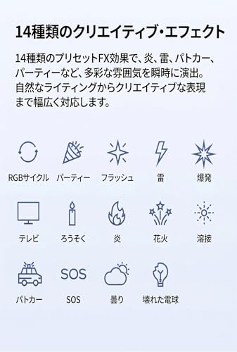 - ✅ تأثيرات إضاءة إبداعية للمشاهد الديناميكية: مع 14 تأثير إضاءة مدمج، بما في ذلك دورة الفضاء اللوني آر جي بي والإضاءة والتلفزيون والنار والألعاب النارية وأكثر من ذلك، توفر إضاءة ML100R إمكانيات غير محدودة للإضاءة السينمائية والتصوير الإبداعي.