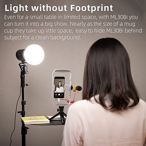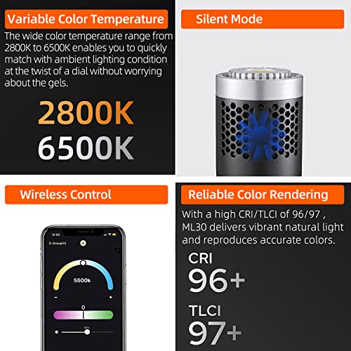 - درجة حرارة ألوان متغيرة. يوفر ML30Bi تعديلًا سلسًا بين الأبيض الدافئ والبارد ليتناسب مع الأجواء للحصول على مظهر طبيعي. نطاق درجة حرارة لون واسع من 2800 كلفن إلى 6500 كلفن مع تصنيفات مؤشر تجسيد ألوان/مؤشر التناسق الضوئي للتلفزيون عالية 96/97، لتلبية احتياجات الإضاءة المحيطة بدقة مذهلة. مع مصدر ضوء ثابت وسطوع ضوء قابل للتعديل من 0% إلى 100%.