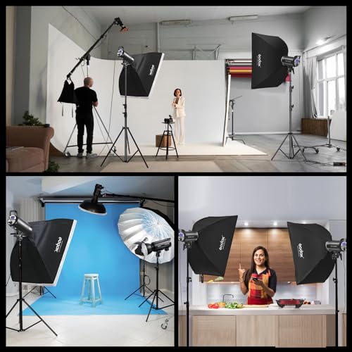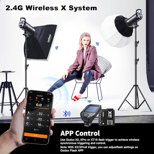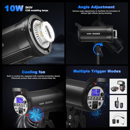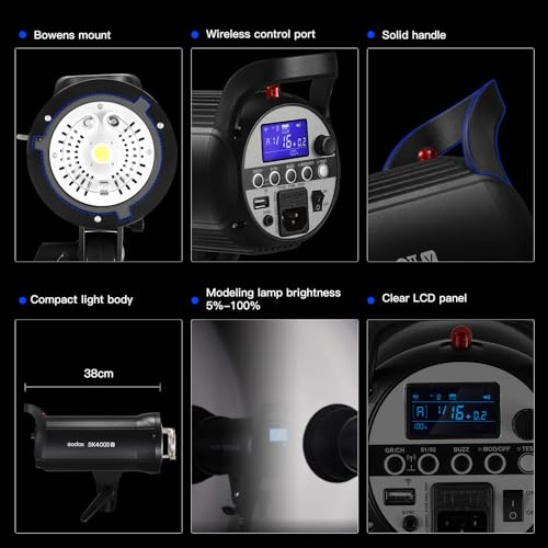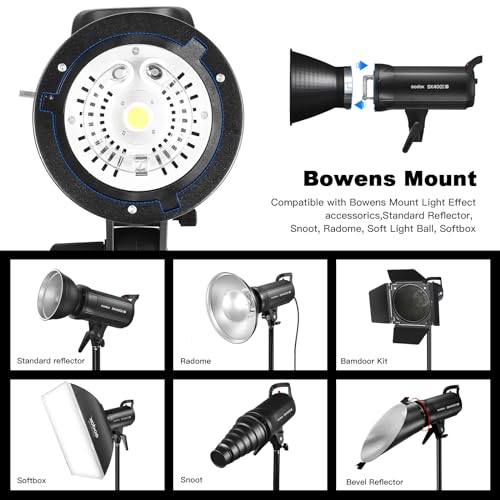 GODOX - مجموعة فلاش ستوديو SK400II-V بقدرة 400 وات و5600±200 كلفن مع لوحة ال سي دي ونظام تحكم لاسلكي 2.4 جيجاهرتز مع قاعدة بوينز لتركيب المصباح للتصوير في الاستوديو والبورتريه والتصوير الإعلاني من جودوكس