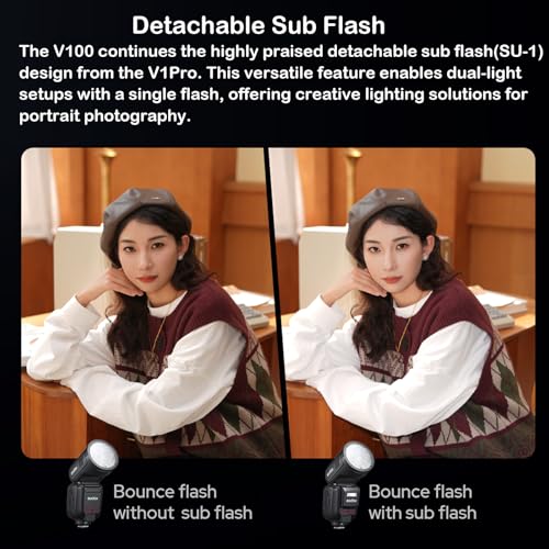 - فلاش ثانوي قابل للفصل: يستمر الطراز V100 بالتصميم الرائع للفلاش الثانوي القابل للفصل لجهاز غودوكس V1 Pro (SU-1). تتيح هذه الميزة متعددة الاستخدامات تكوينات الإضاءة المزدوجة مع فلاش واحد، مما يوفر حلولًا إبداعية للتصوير الفوتوغرافي.