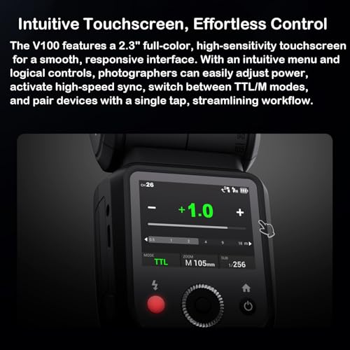 - شاشة لمس بديهية وتحكم بسيط: يتميز V100 بشاشة لمس ملونة عالية الحساسية مقاس 2.3 بوصة، مما يوفر واجهة سلسة وسريعة الاستجابة. مع قائمة بديهية وعناصر تحكم منطقية، يمكن للمصورين ضبط الطاقة بسهولة، وتفعيل المزامنة عالية السرعة، والتبديل بين أوضاع TTL/M، وإقران الأجهزة بلمسة واحدة، وتحسين سير العمل.