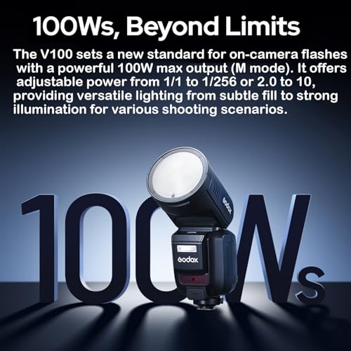 - 100 واط، ما وراء الحدود: يضع V100 معيارًا جديدًا لمضات الكاميرا مع أقصى خرج قوي يبلغ 100 واط (وضع M). يوفر طاقة قابلة للتعديل من 1/1 إلى 1/256 أو 2.0 إلى 10، مما يوفر إضاءة متعددة الاستخدامات، من التعبئة الدقيقة إلى الإضاءة المكثفة لسيناريوهات التصوير المختلفة.